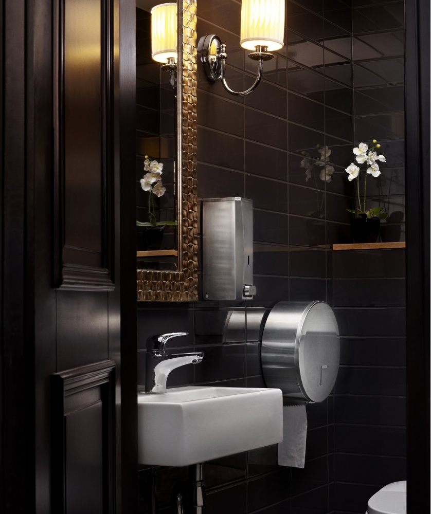 Plašs Katrin® nerūsējošā tērauda turētāju klāsts papīra dvieļiem, tualetes papīram, ziepēm, kā arī atkritumu tvertnes.