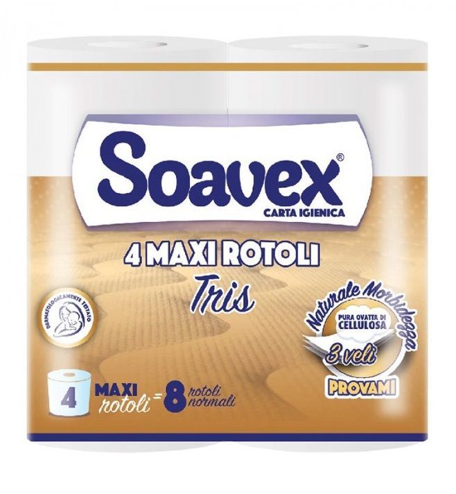 Tualetes papīrs SOAVEX TRIS, 3-slāņu, 4 ruļļi, celuloze, 155 loksnes, 17m