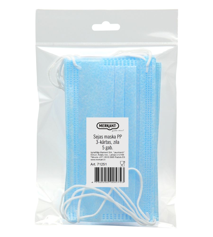 Sejas aizsargmaska 3-slāņi CE, 5 gab., zila